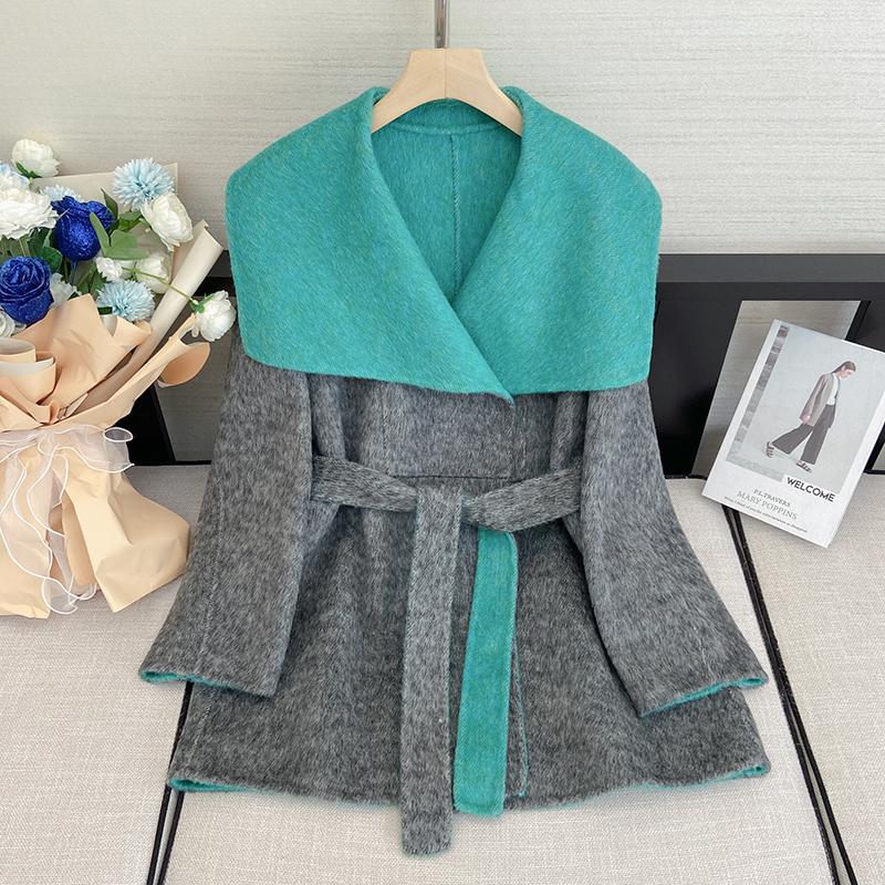 韩系大翻领短款双面呢子大衣女设计感小个子秋冬羊毛系带毛呢外套