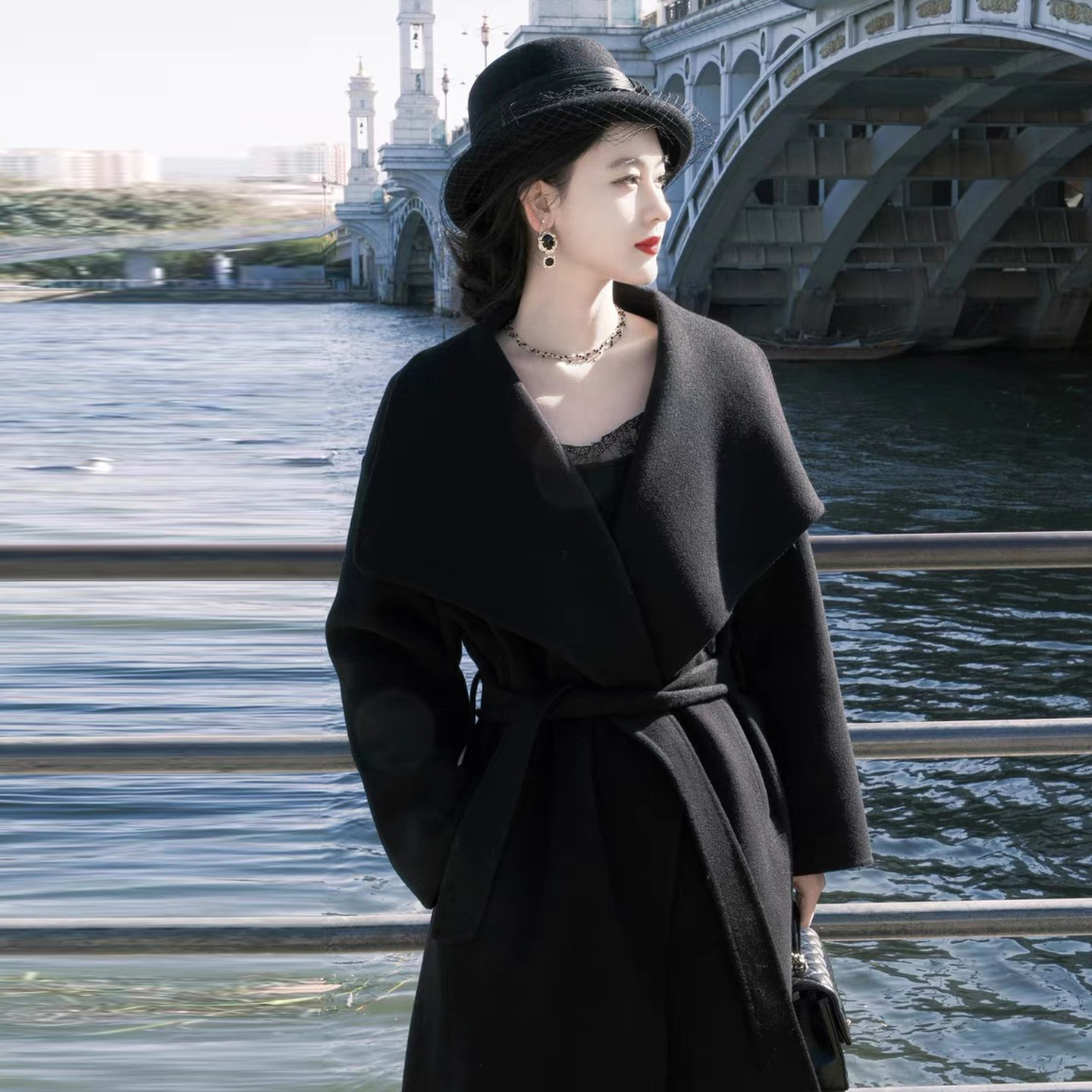 手工羊毛双面呢系带长款毛呢大衣外套女装复古黑色翻领羊绒呢子衣