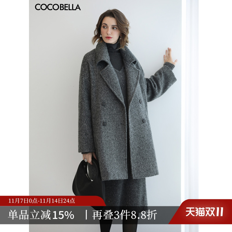 COCOBELLA灰色大翻领毛呢大衣女25新款长毛绒呢子外套WL910A