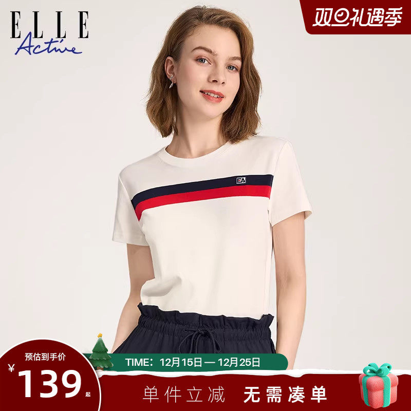 ELLE Active2025春夏新款圆领白色t恤女休闲修身条纹短袖上衣纯棉