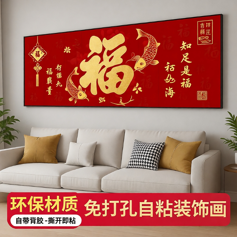 中式福字装饰画客厅自粘贴画卧室床头背景墙壁山水画新年春节年画