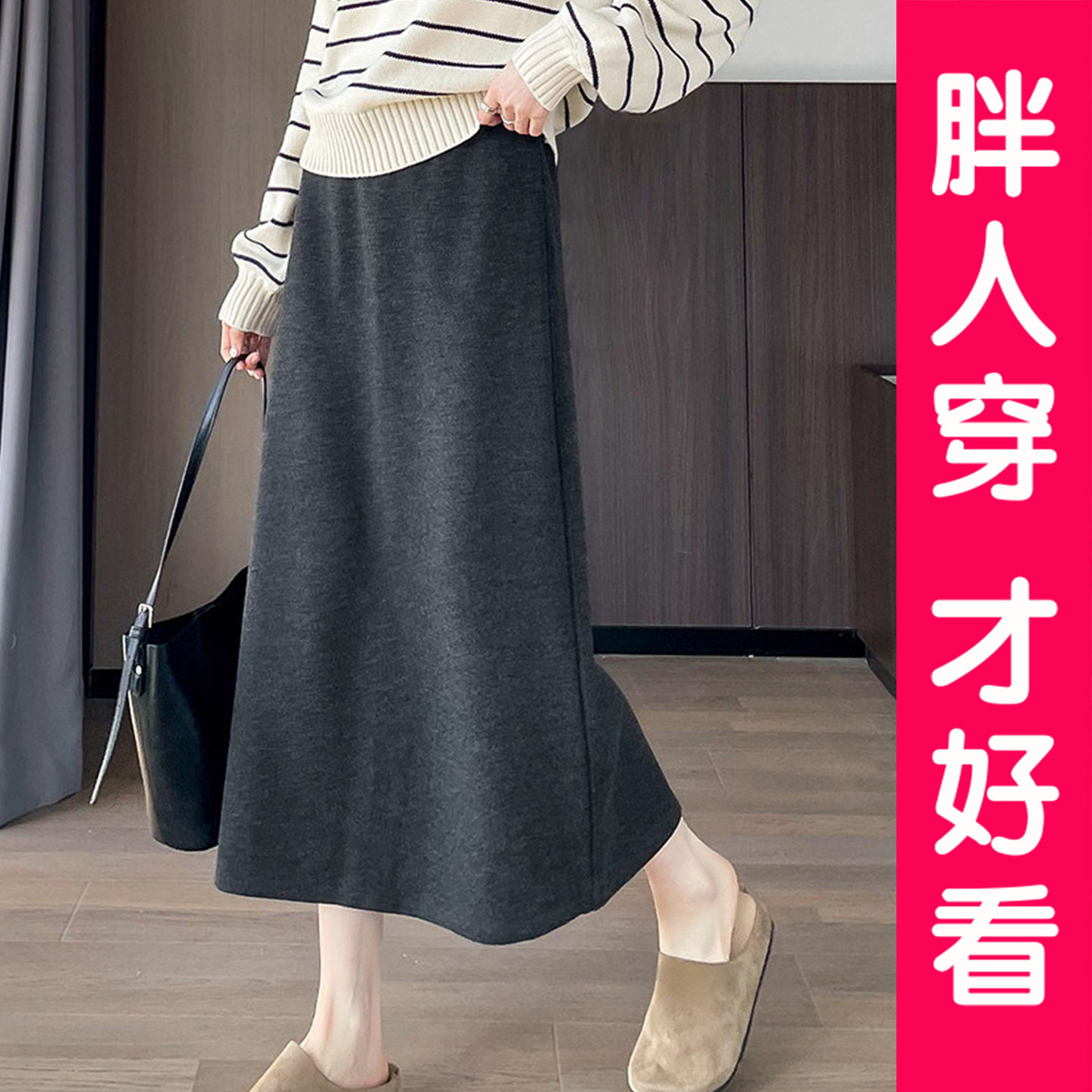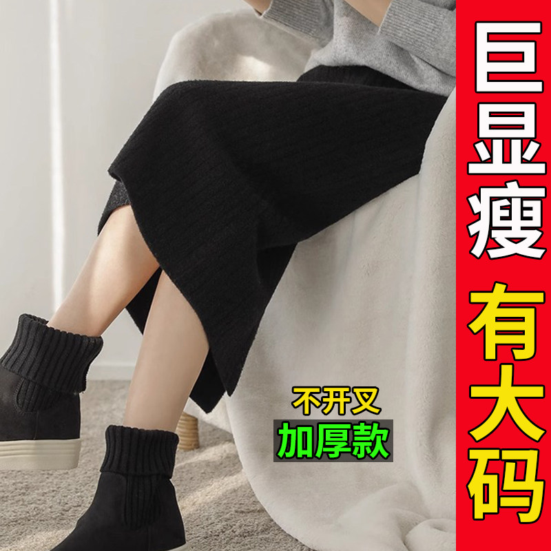 大码加绒加厚针织半身裙女直筒裙包臀裙开叉一步裙长裙子胖mm秋冬