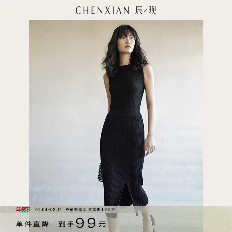 【到手99元】小众开叉黑色高腰针织半身裙直筒包臀a字裙子中长款