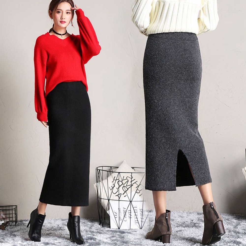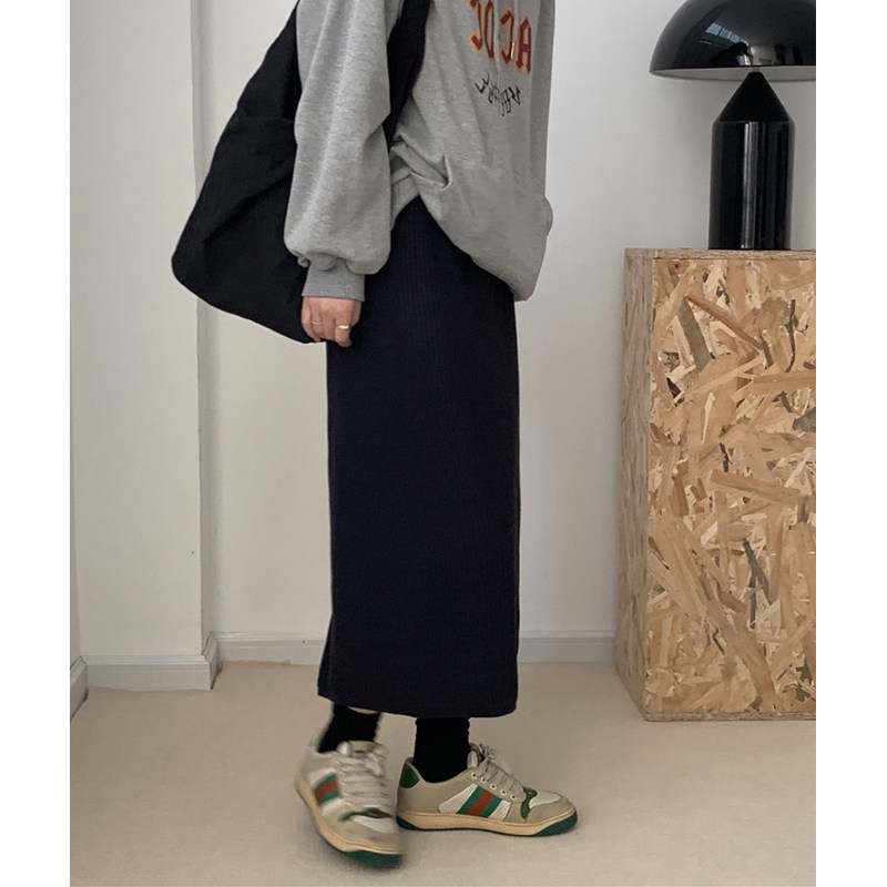 G016纯色高腰显瘦修身开叉松紧腰包臀裙秋冬新款针织长裙子半身裙