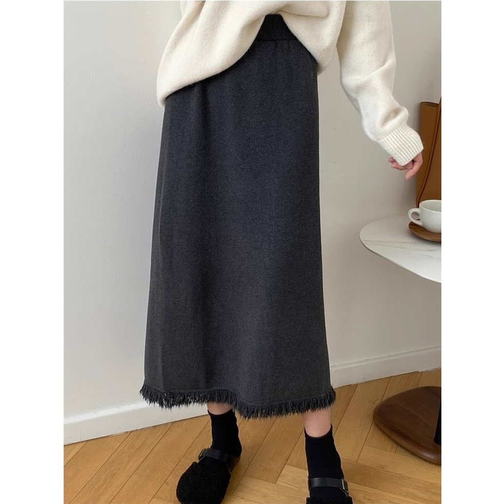 针织半身裙女秋冬加厚中长款流苏开叉a字直筒一步包臀毛线长裙子
