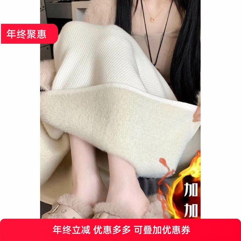 高腰加绒加厚针织包臀裙女秋冬直筒开叉纯色百搭半身裙一体绒裙子