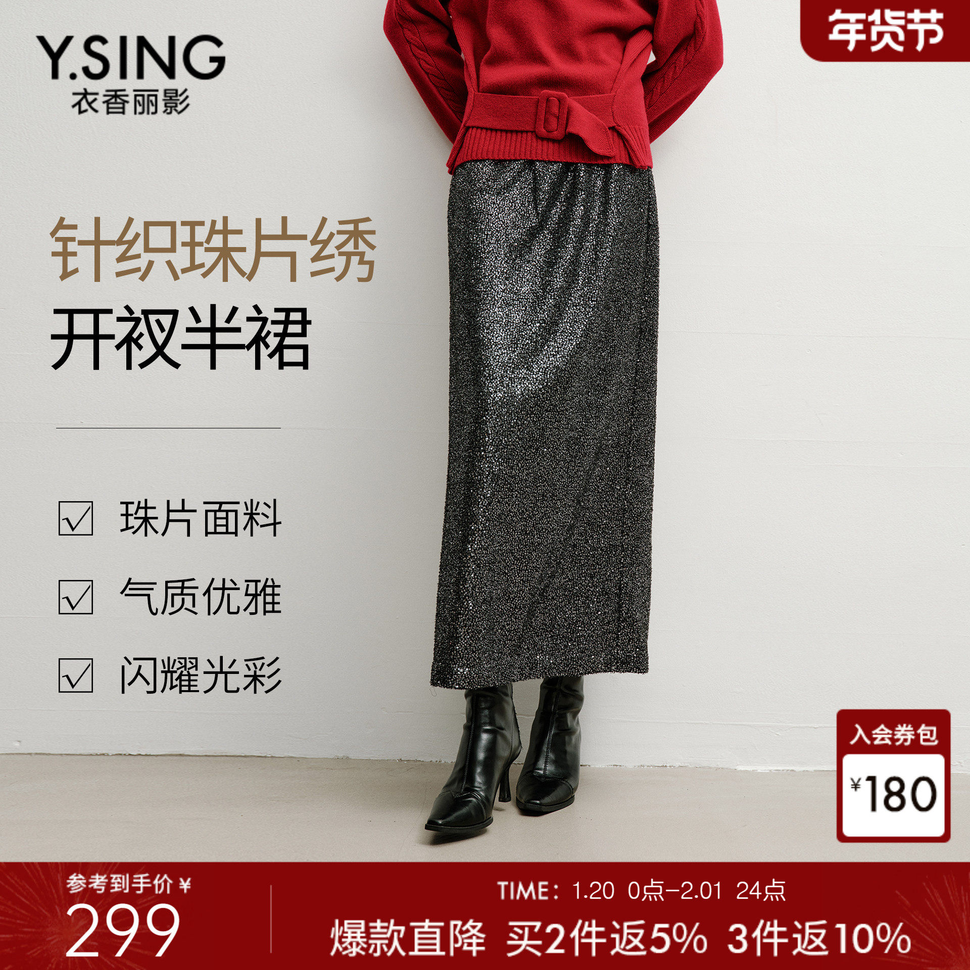 衣香丽影针织珠片绣半身裙女2025冬装新款设计感开叉包臀中长裙子