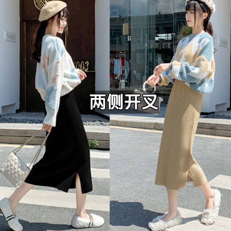 秋冬季韩国高腰显瘦开叉中长款针织半身裙女美拉德包臀A字长裙子