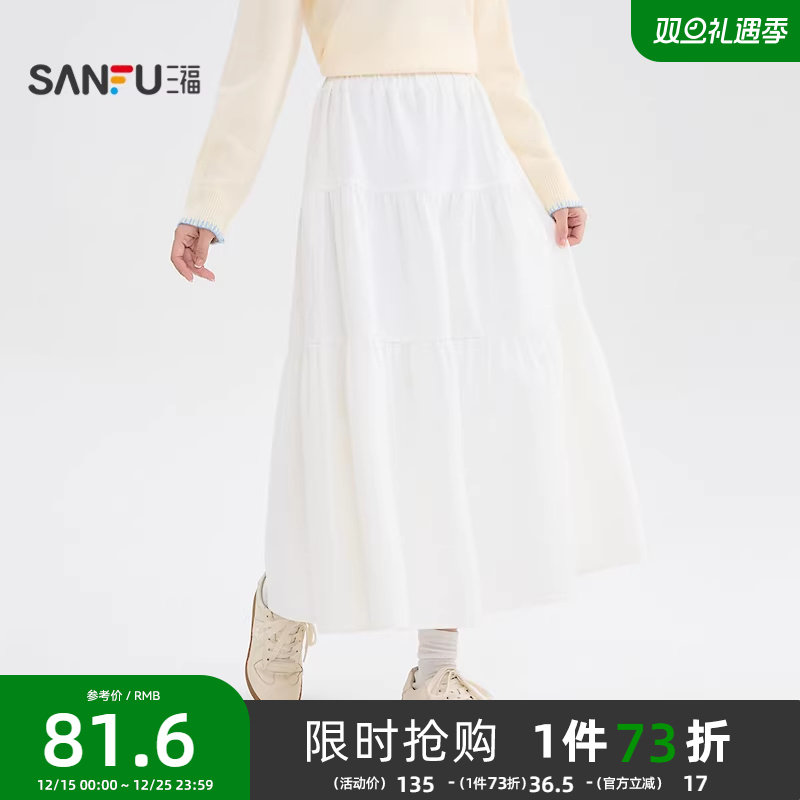 三福长裙女2025新款夏季韩系白色蛋糕裙休闲高腰气质半身裙子女装