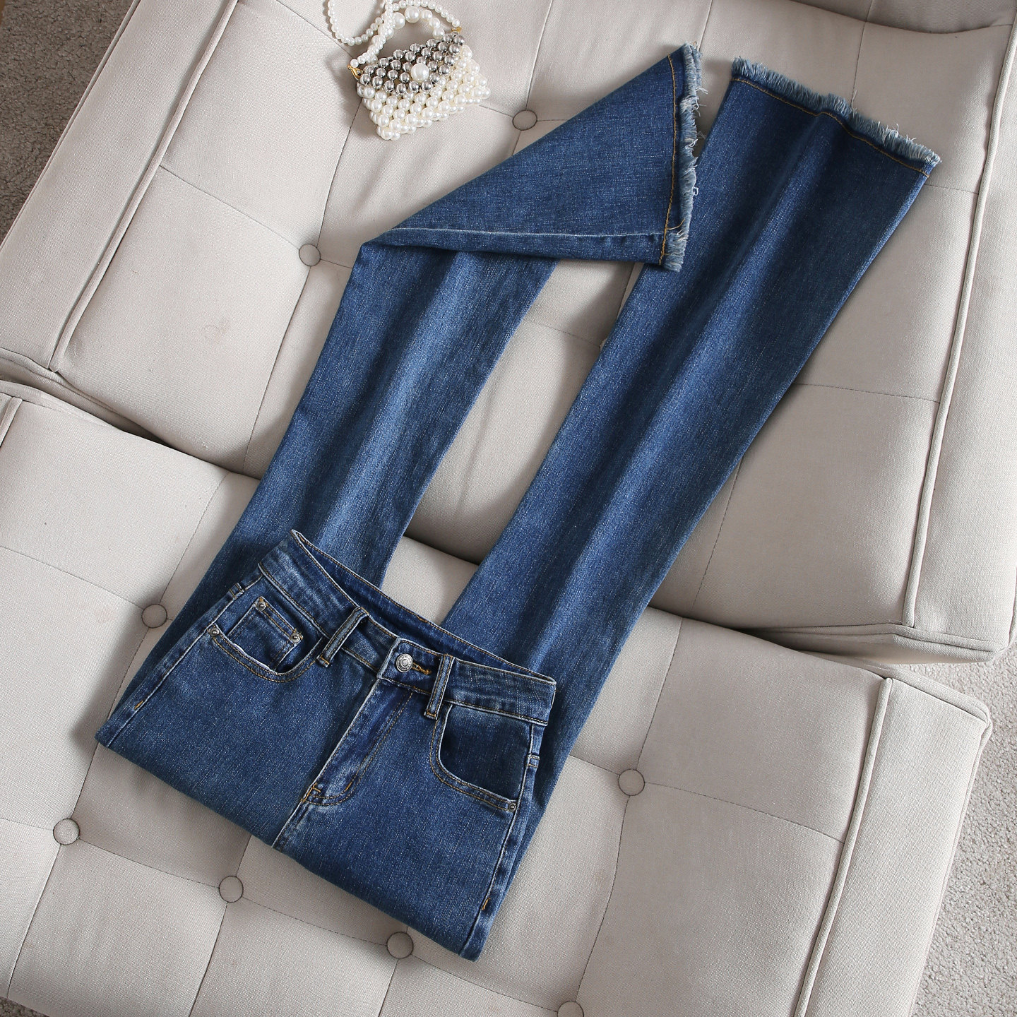 蓝色毛边微喇牛仔裤女春季新款大码胖mm高腰显瘦梨形身材弹力裤子