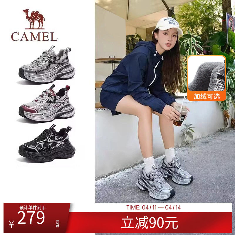 骆驼女鞋老爹鞋新款银色网面/加绒版可选老爹鞋厚底休闲运动鞋子