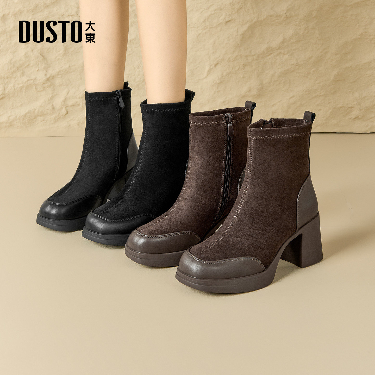 大东时装靴2025冬季新款休闲舒适圆头粗跟高跟短靴女鞋D1151A