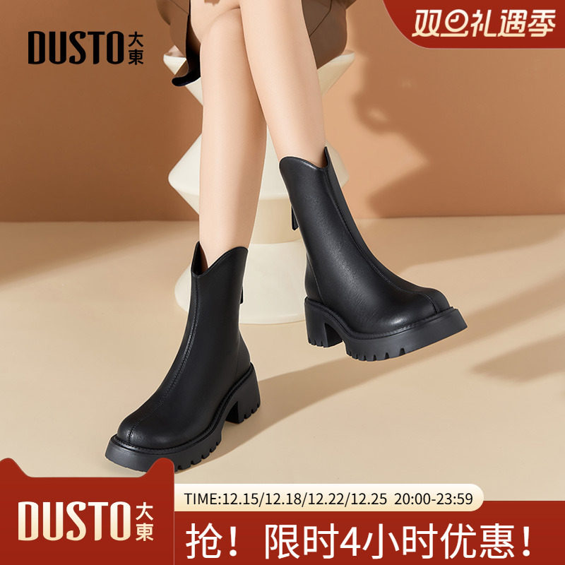 大东粗跟高跟短靴女2025新款秋冬女式皮靴黑色加绒靴子切尔西女靴