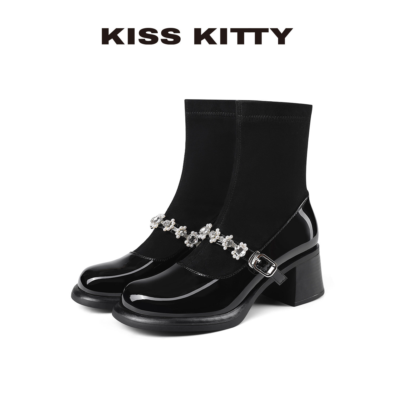 KISSKITTY弹力靴女2025冬季新款黑色玛丽珍袜靴粗跟高跟短靴子