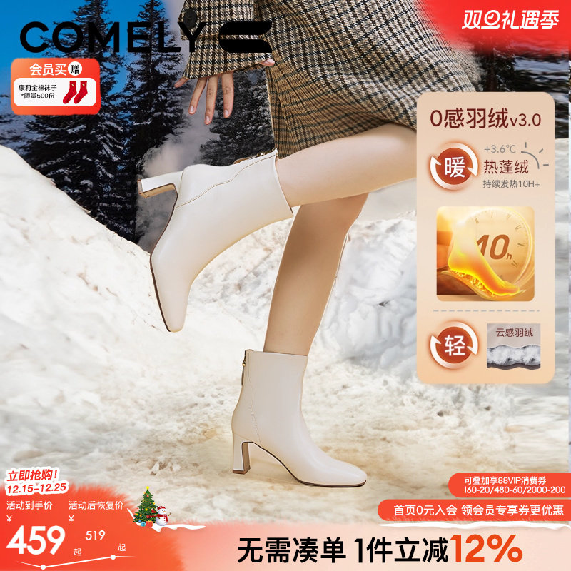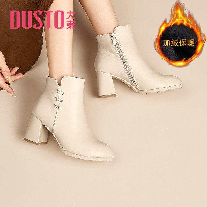 大东官方粗跟高跟短靴女2025新款冬季加绒皮靴高跟靴白色靴子女款