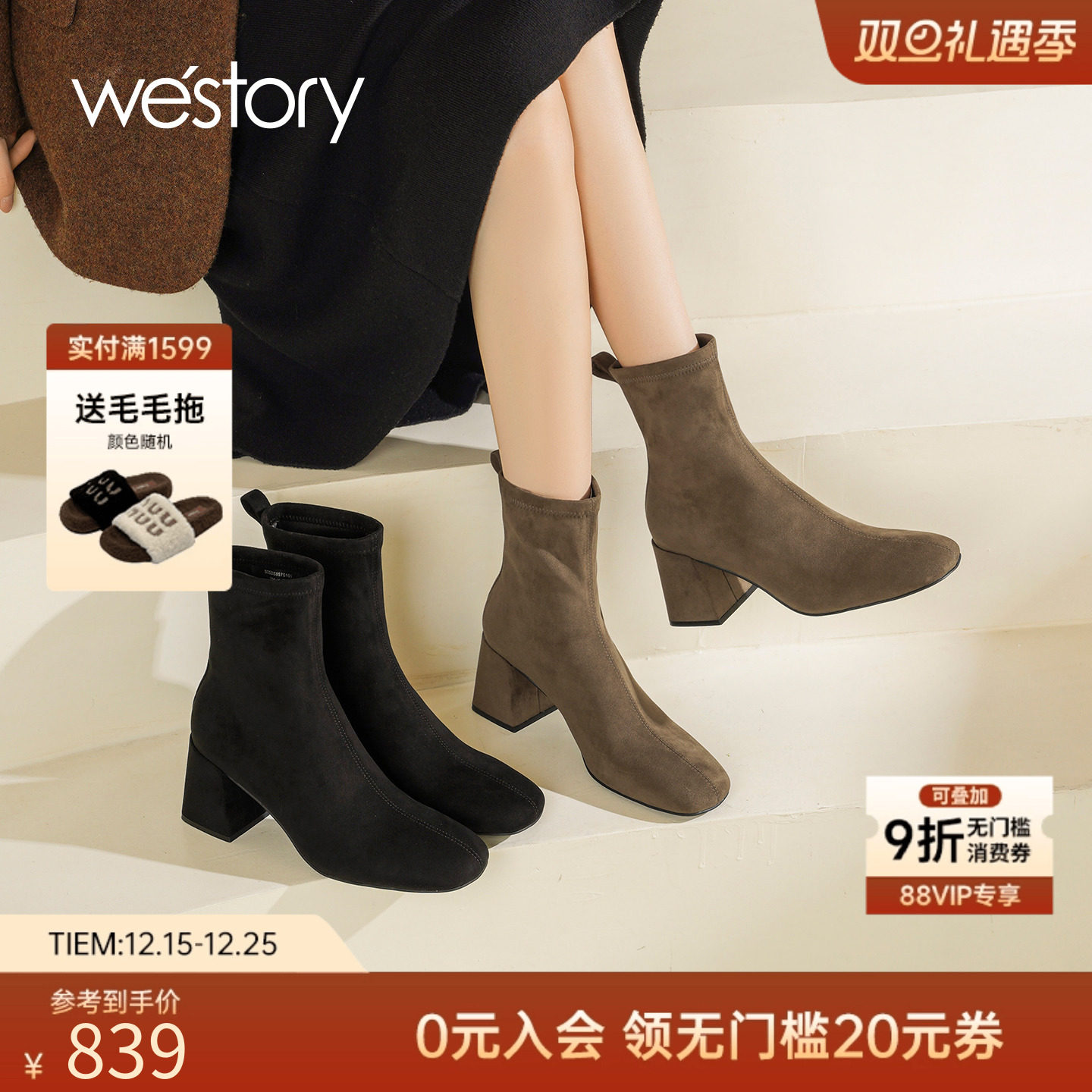 westory西部牛仔靴2025秋冬新款绒面粗跟高跟短靴女通勤瘦瘦靴