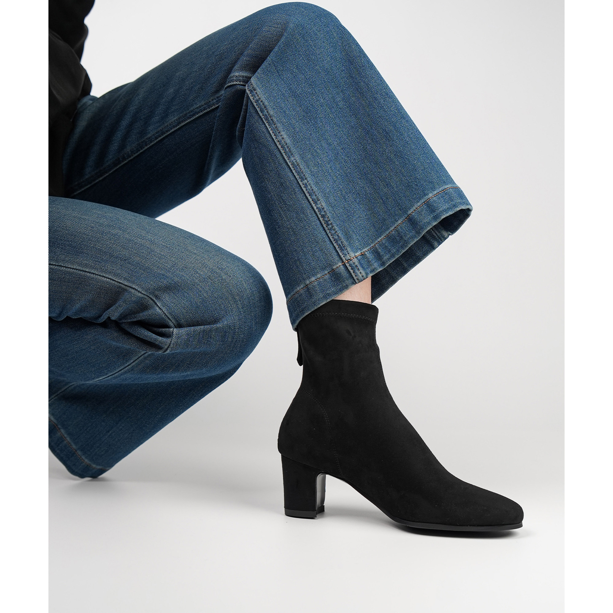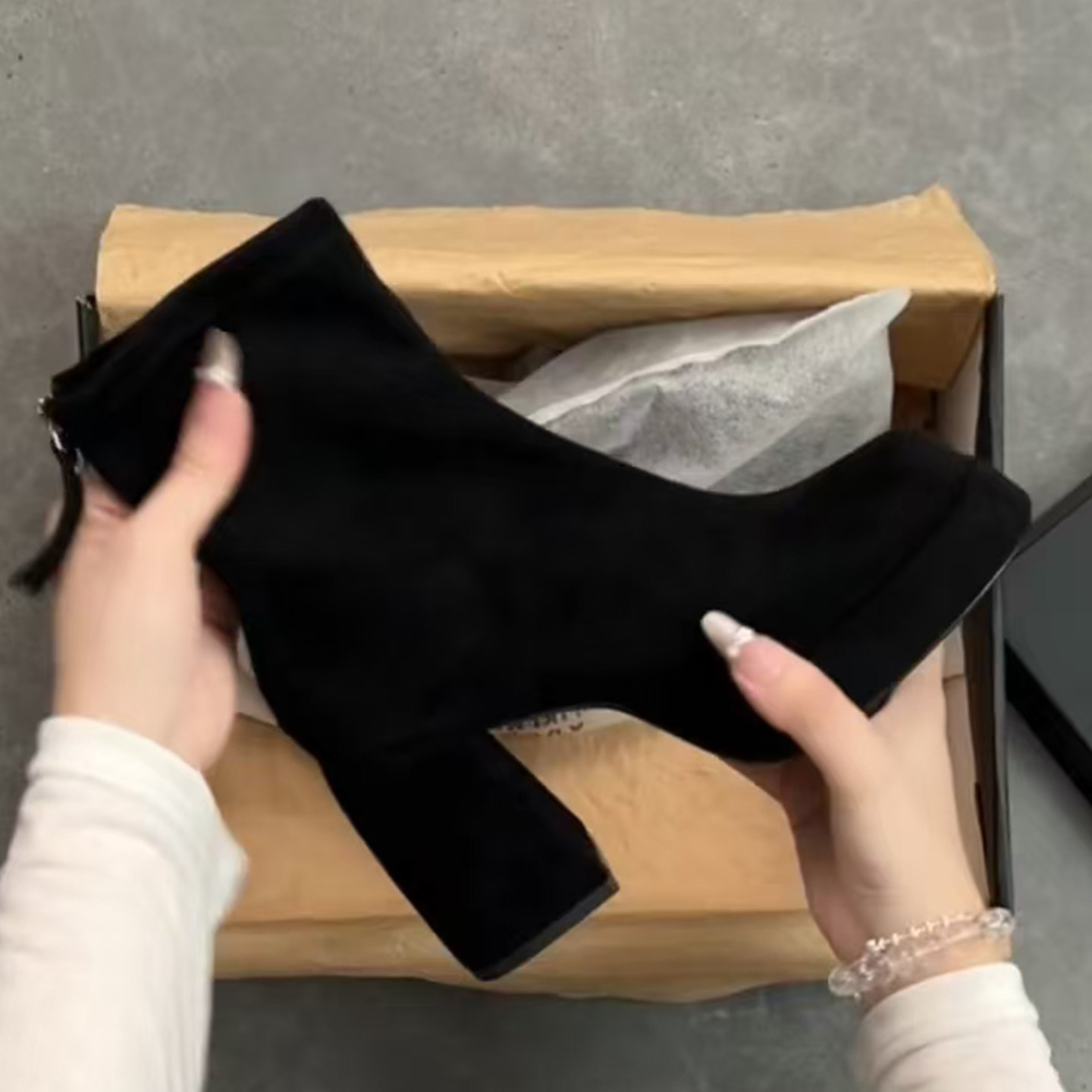 Fermina 简约圆头弹力绒面瘦瘦靴女粗跟高跟短靴黑色通勤风女靴秋