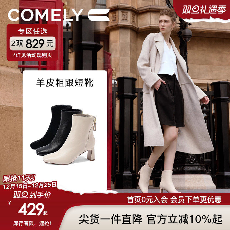 康莉商场新款真皮时装靴女2024年冬季时尚粗跟高跟短靴女款中筒靴