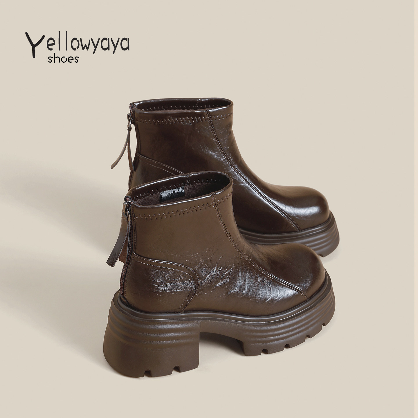 粗跟高跟短靴女马丁靴防水台2025冬季新款圆头后拉链瘦瘦靴英伦风