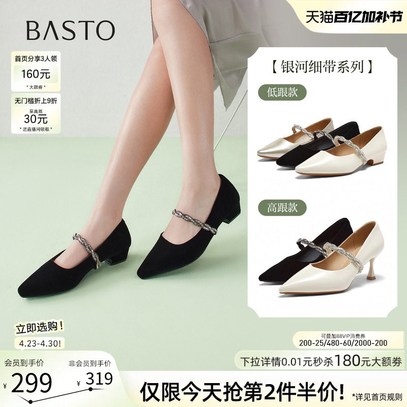 百思图26夏商场新款尖头粗跟绒面高跟鞋玛丽珍法式女单鞋W0128AQ6