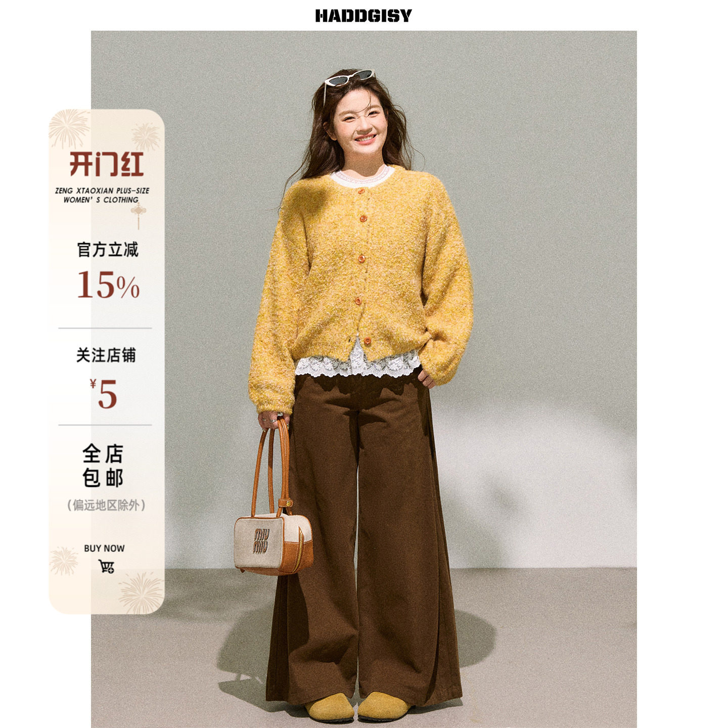 曾小咸大码女装 适合胖mm黄色毛衣开衫显瘦阔腿休闲裤套装2025冬