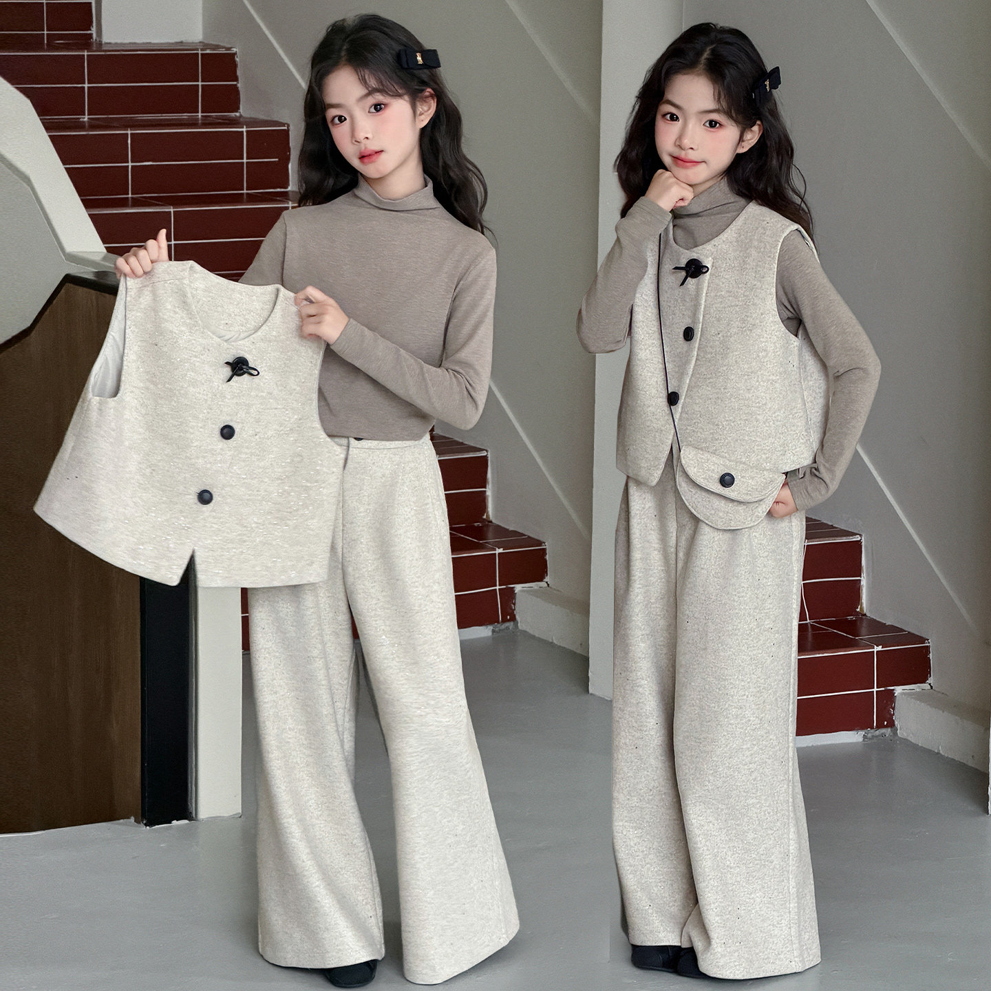 女童春秋套装2026新款洋气中大儿童撒银马甲阔腿裤气质三件套韩版