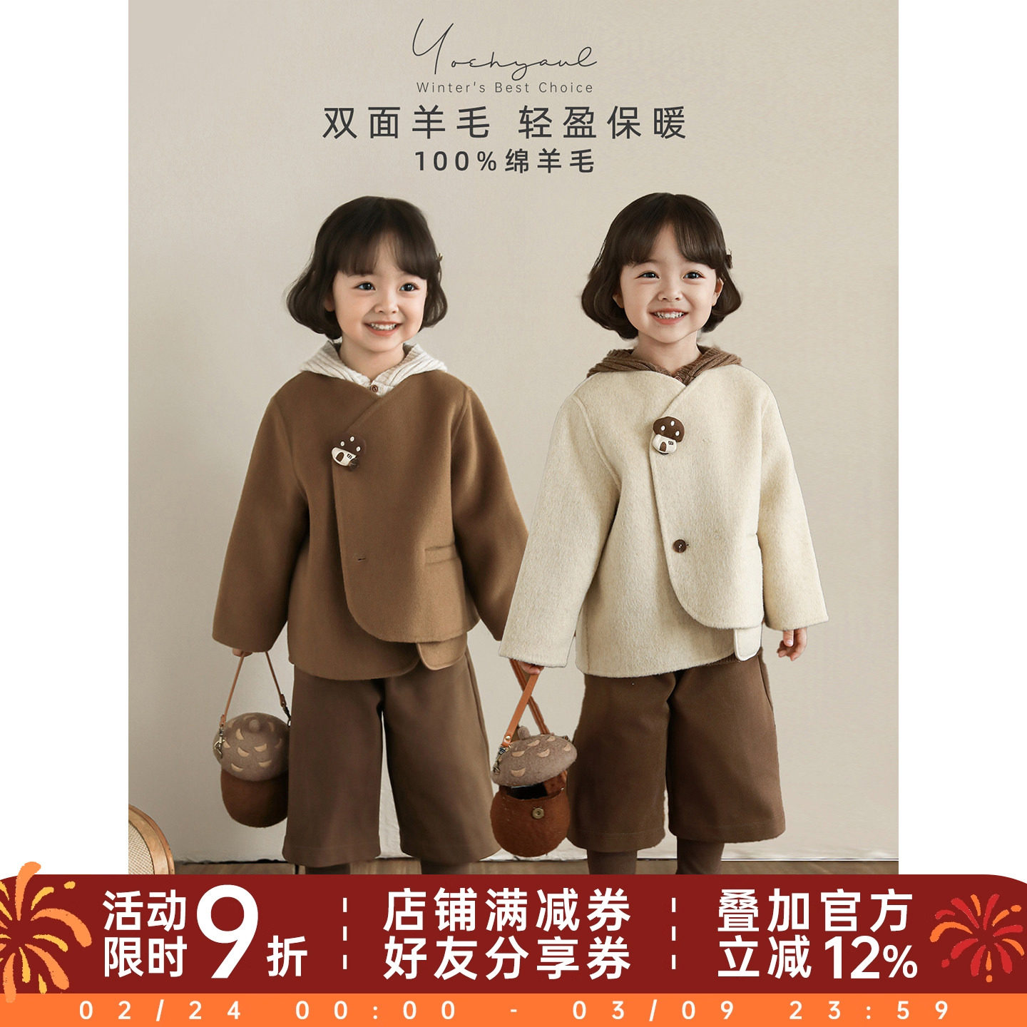 幼悠 女童冬季套装儿童洋气可爱时尚休闲阔腿裤小V领双面呢大衣潮
