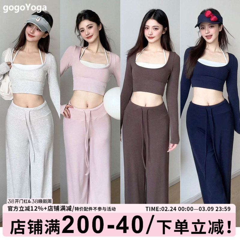 休闲运动套装女春季带胸垫假两件长袖瑜伽服显瘦修身阔腿裤健身服