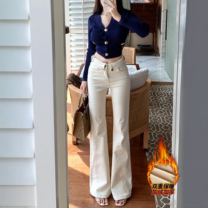 李李服饰加绒米白翻边字母微喇牛仔裤女2025冬季高腰不贴腿长裤