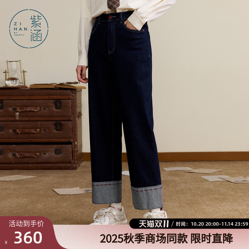 紫涵撞色翻边直筒牛仔裤女2025年秋季新款复古高腰显瘦百搭休闲裤