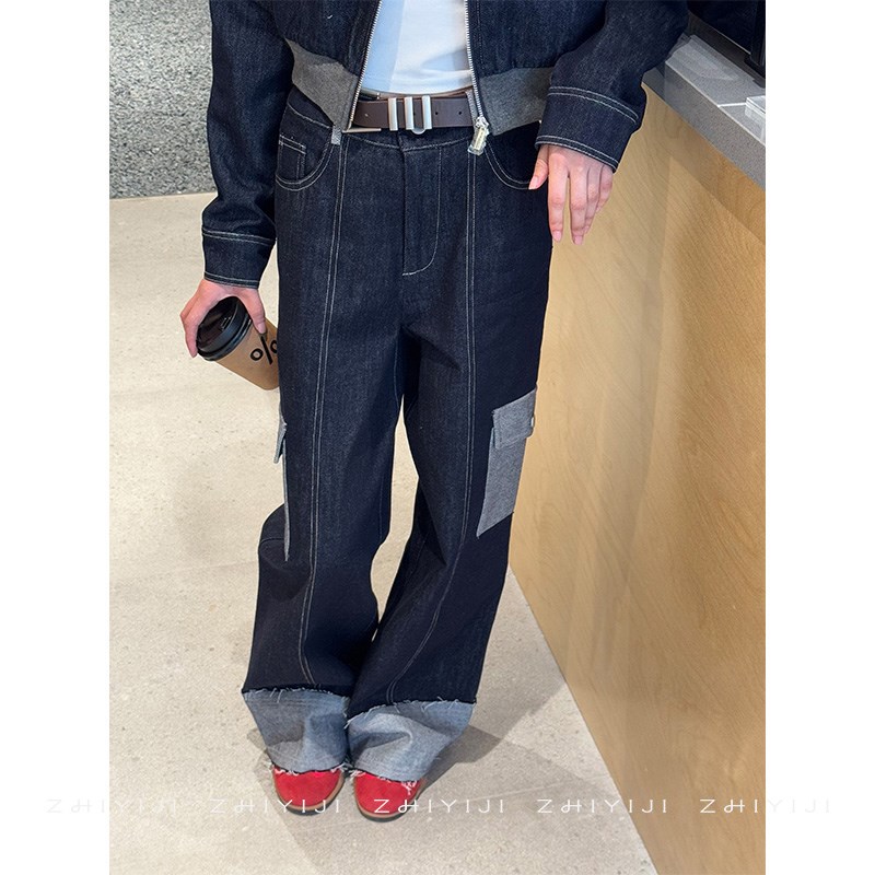 25春复古水洗多口袋翻边牛仔裤 女高腰宽松阔腿直筒拖地休闲长裤
