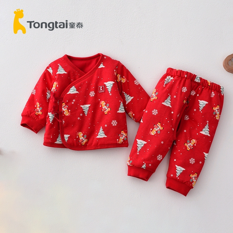 童泰秋冬0-3月新生婴儿男女宝宝开裆和服棉服套装红色薄棉两件套