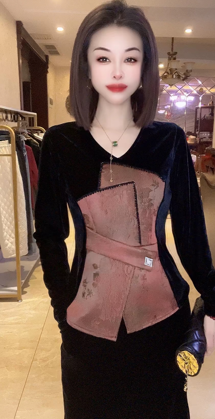 新中式国风V领真丝丝绒腰带拼色加棉和服外套女2025秋冬棉服上衣
