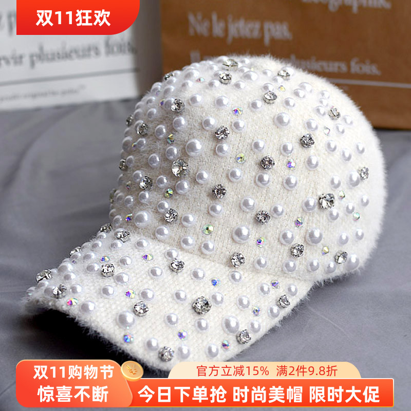 重工水钻珍珠秋冬天鸭舌帽子韩版镶闪钻女轻奢百搭时尚白色棒球帽