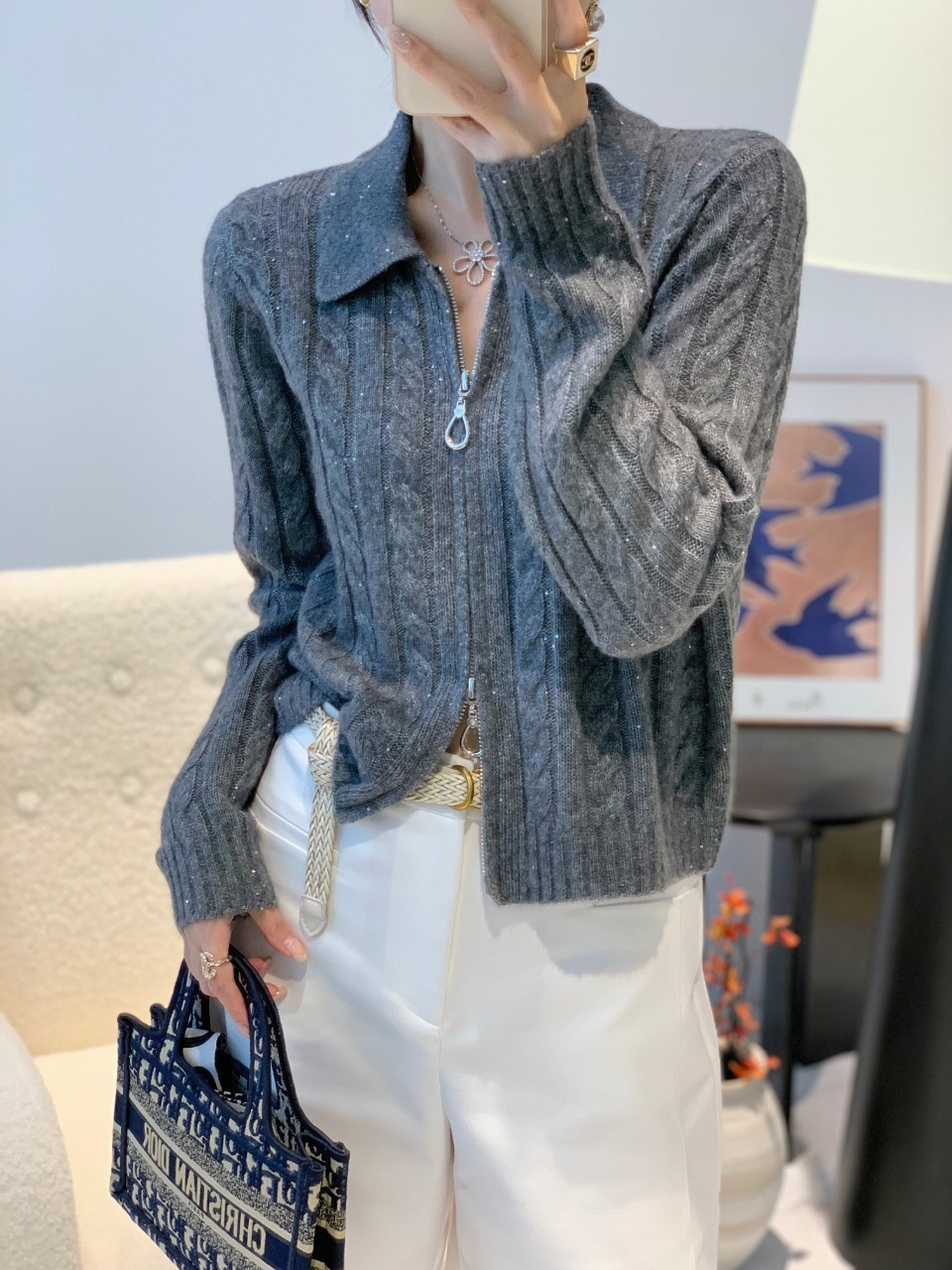 翻领精致麻花毛衣 闪亮双拉链针织开衫 秋季新款宽松短款毛衣外套