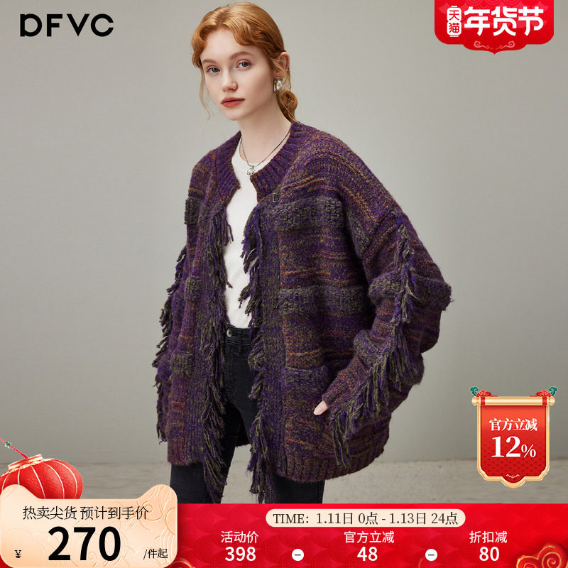 dfvc复古慵懒风针织开衫女2025年冬季新款流苏宽松短款毛衣外套厚