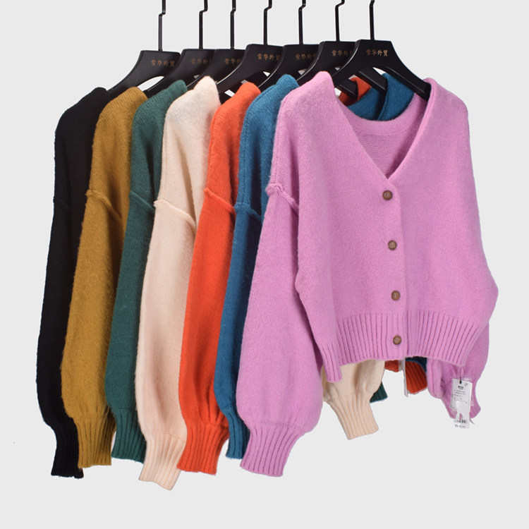 外贸原单V领长袖针织开衫女 秋冬新款设计感外穿宽松短款毛衣厚款