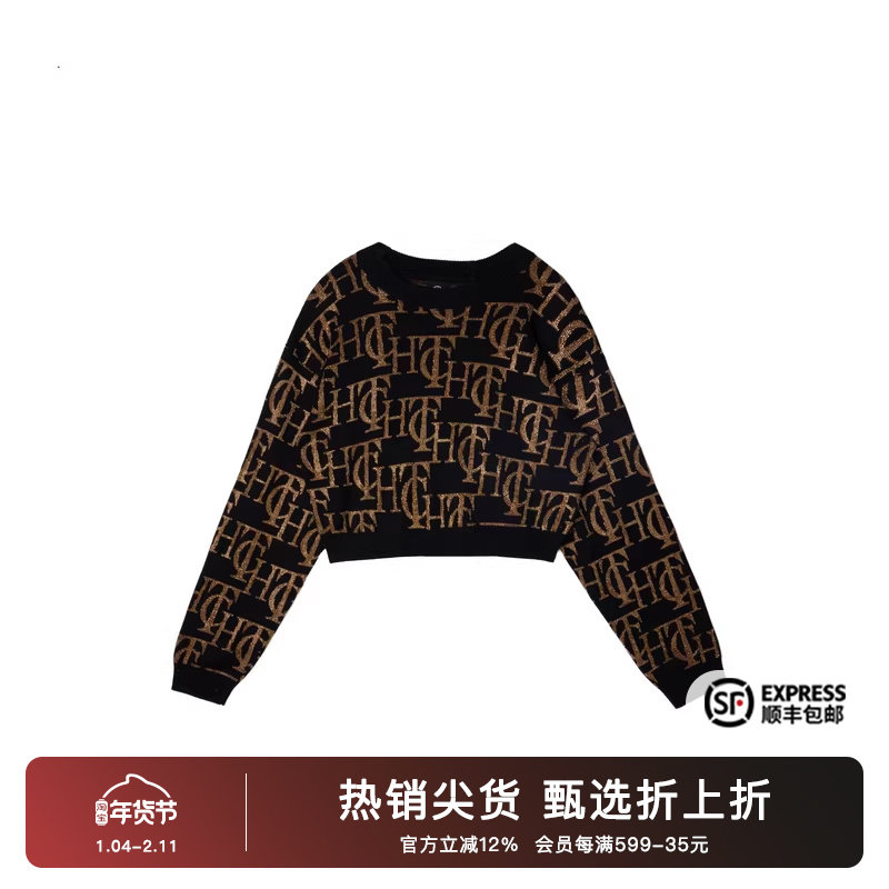 TCH美式复古宽松短款毛衣女2025春秋新款烫钻满印圆领针织衫上衣