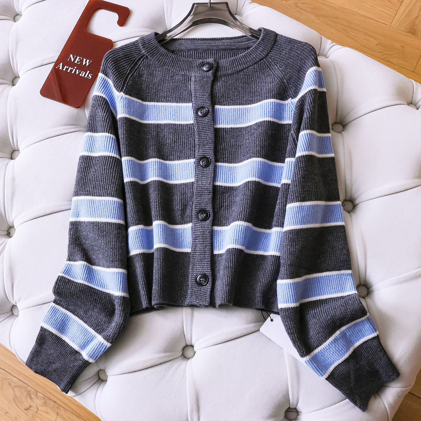 撞色条纹绵羊毛混纺插肩袖圆领宽松短款毛衣长袖女装针织开衫Q544