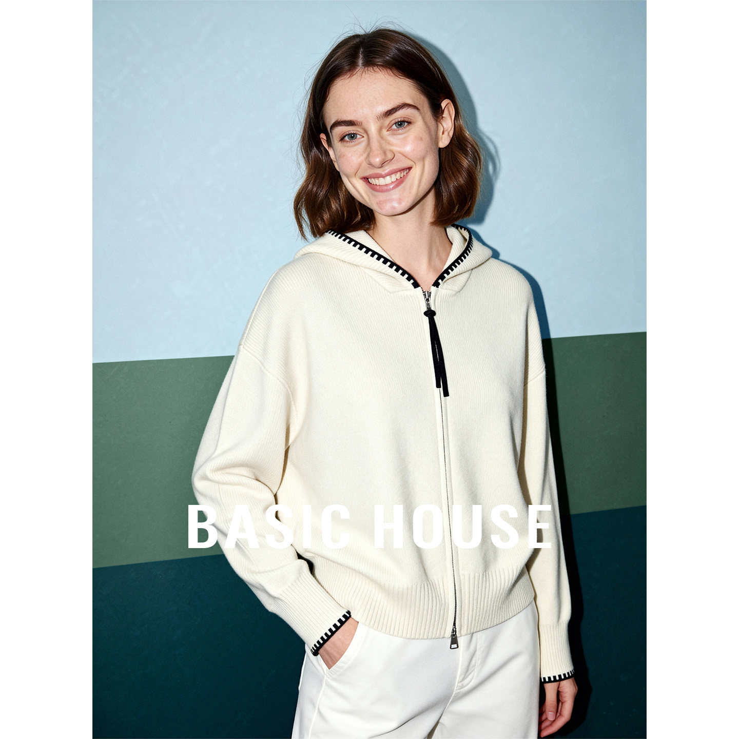 Basic House/百家好连帽双开拉链开衫上衣2025春季宽松短款毛衣女