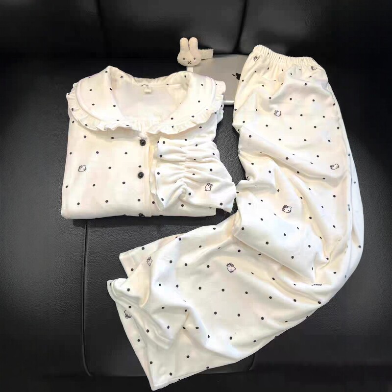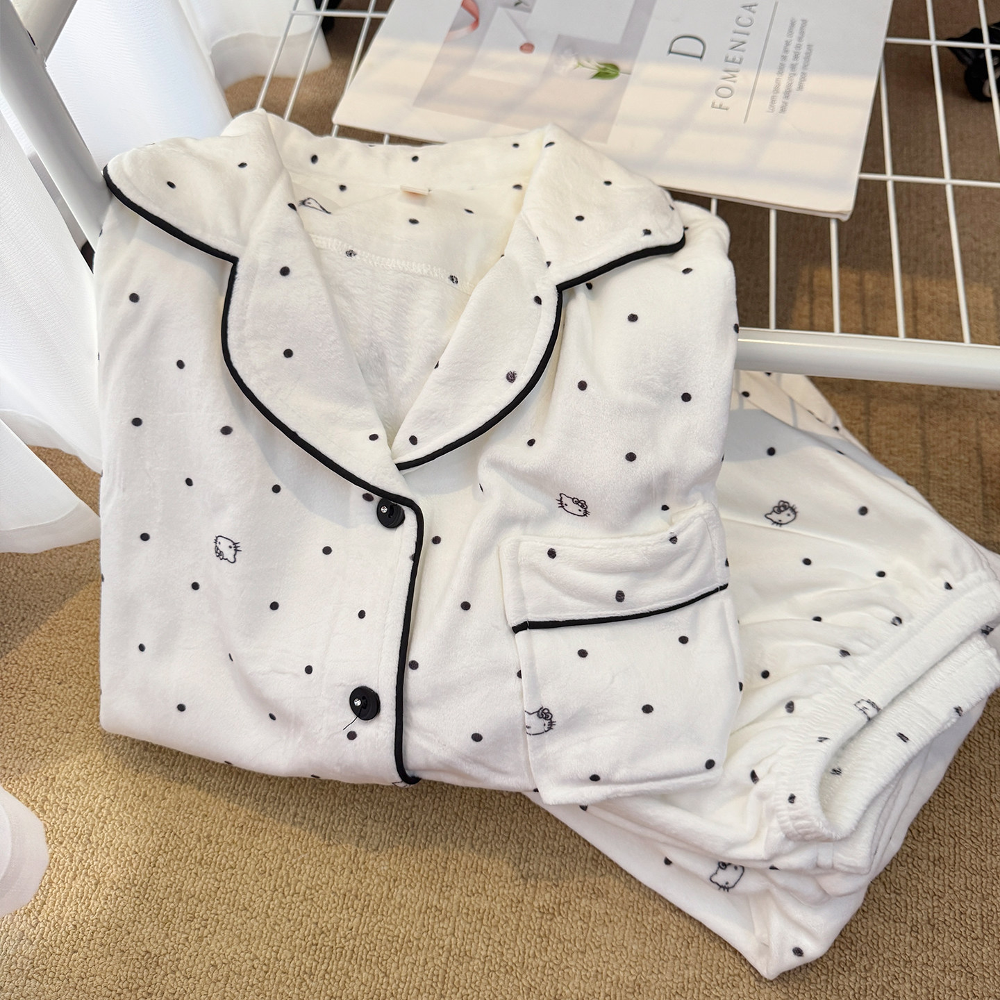 白色波点凯蒂猫德绒睡衣女秋冬新款加厚法式娃娃领长袖家居服套装