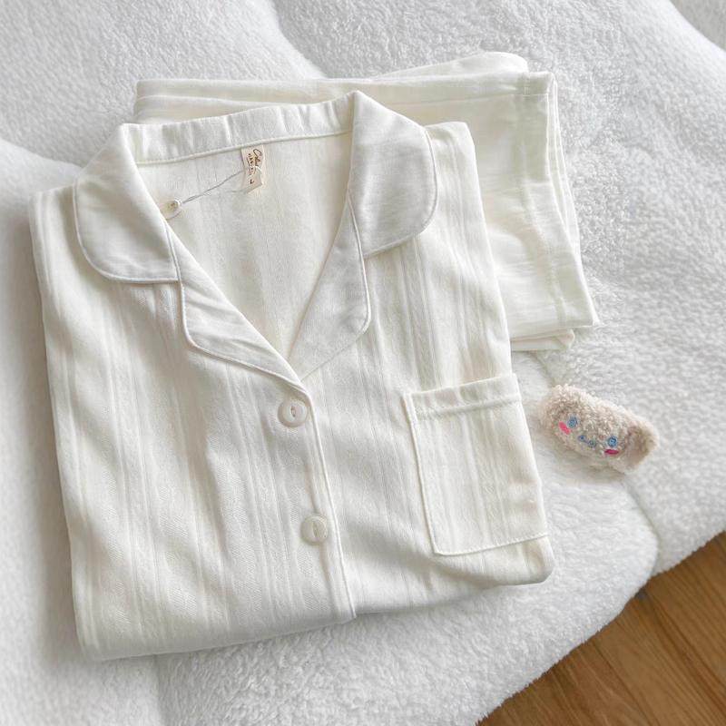 水洗棉纯白翻领长袖睡衣女纯棉简约白色大码亲肤家居服套装可外穿