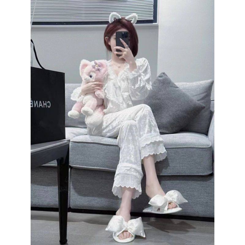 睡衣女款春秋季金丝绒长袖套装网红新款性感蕾丝白色秋冬款家居服