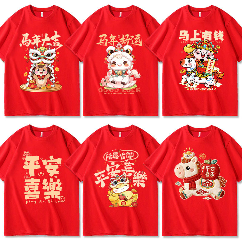 2026马年本命年衣服红色新年t恤男女纯棉短袖情侣喜庆大码定制DIY