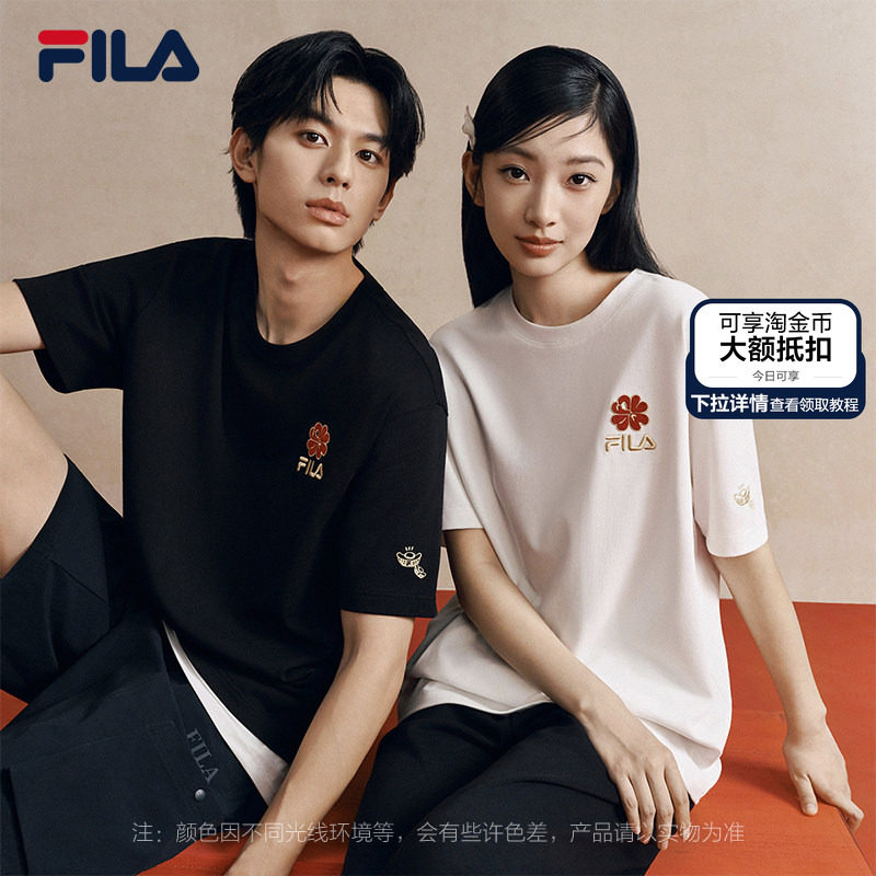 马上起飞FILA斐乐情侣短袖T恤2026春新年红色上衣男海棠花刺绣女