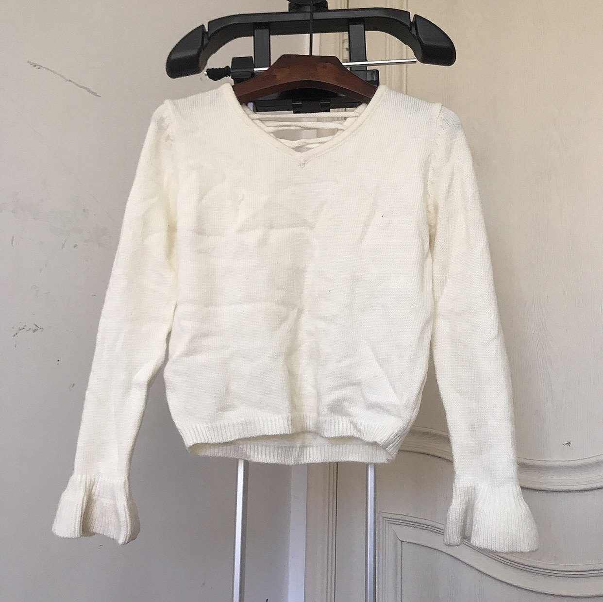 白色后背绑带针织衫女新款百搭宽松短款套头喇叭长袖收腰毛衣线衫
