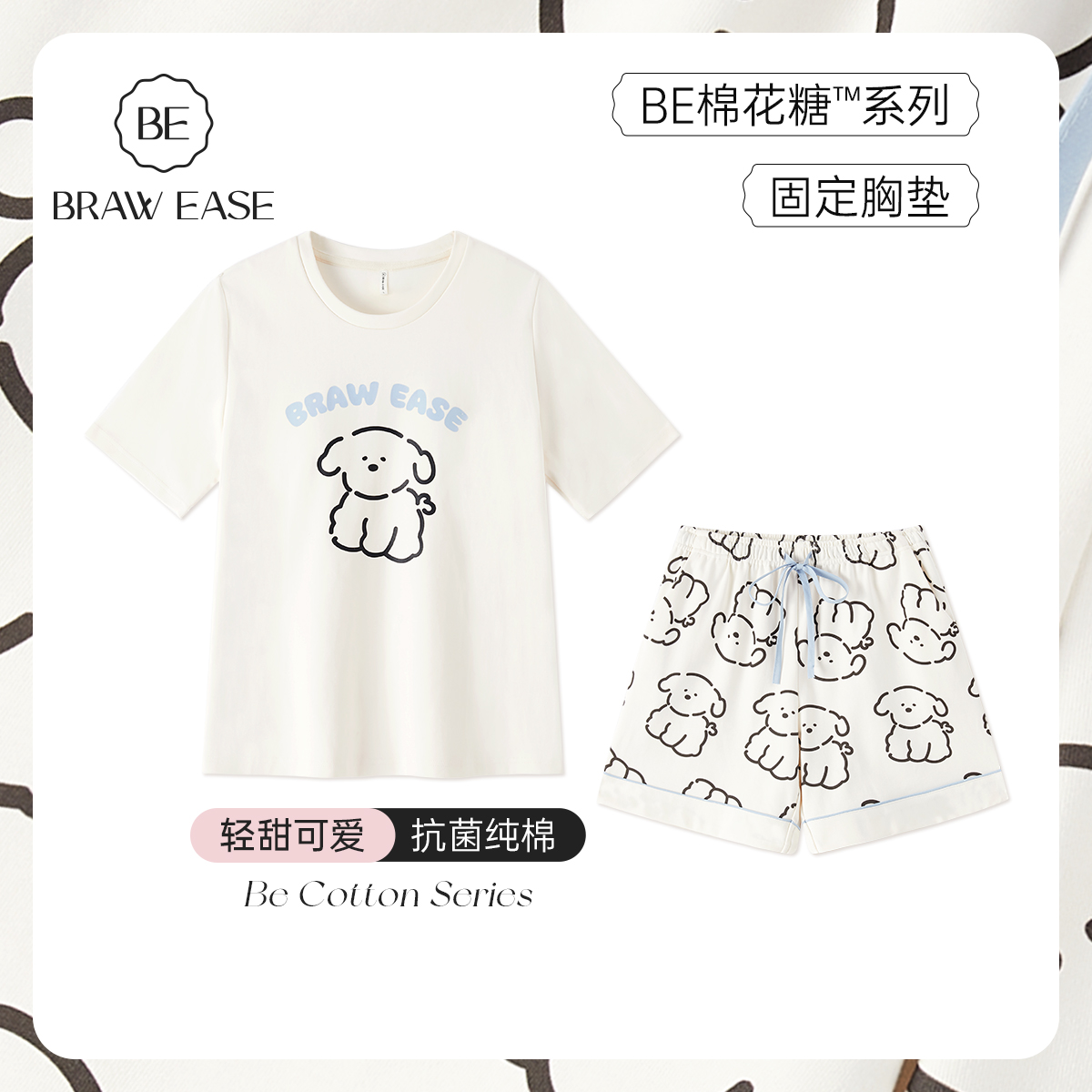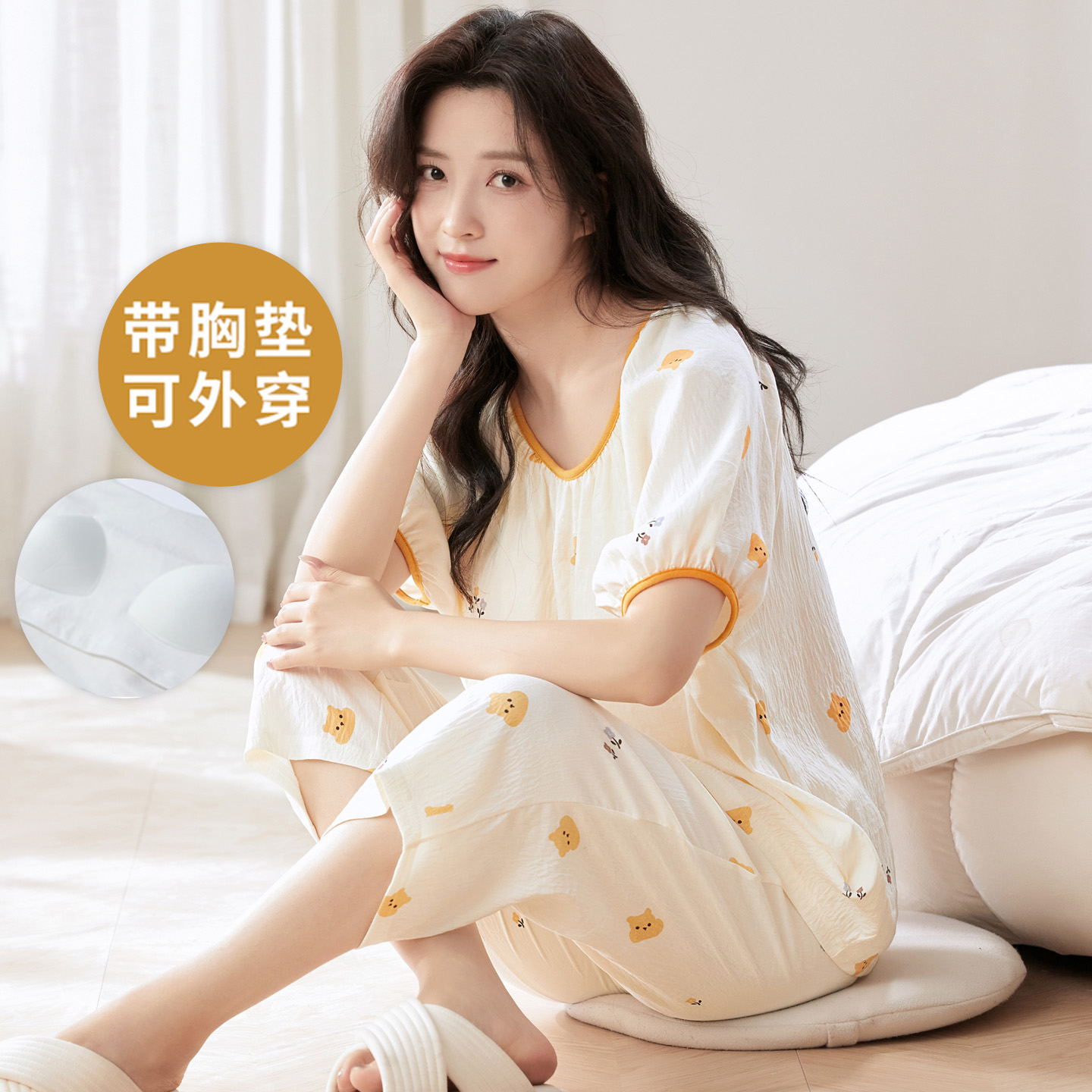 悦内带胸垫睡衣女夏季夏天短袖短裤纯棉家居服休闲可外穿出门套装