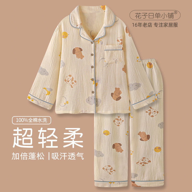 儿童薄款双层棉纱睡衣 夏季女童家居服 男宝宝长袖灯笼裤棉布套装