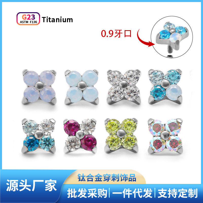 F136钛合金耳钉5A锆石耳骨钉耳蜗钉唇钉女人体穿刺饰品四叶草耳饰