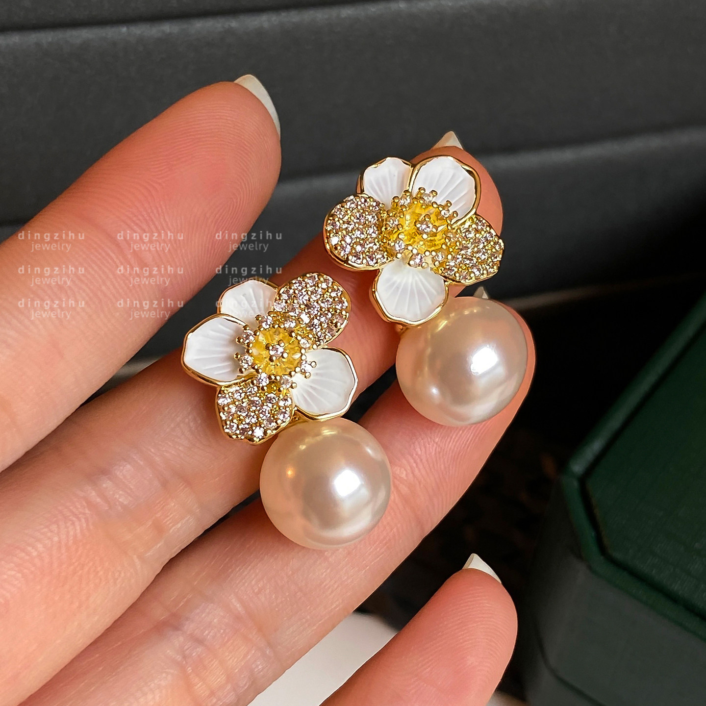 镶钻花朵珍珠耳环女精致复古女人味高级感轻奢气质耳钉巨好看耳饰